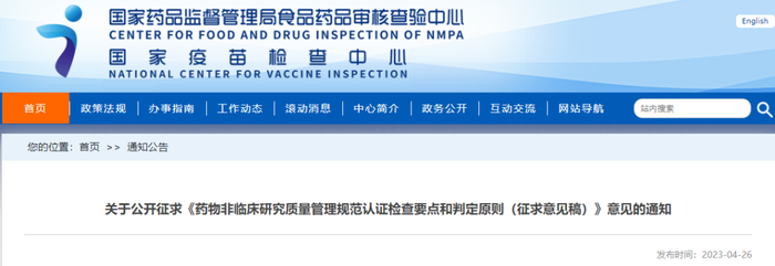 2023年04月26日,国家药监局审核查验中心发布了《药物非临床研究质量管理规范认证检查要点和判定原则(征求意见稿)》,征求意见截止2023年5月26日。