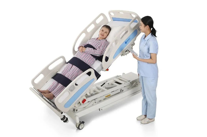 康复床结合了起立床的治疗功能与病床的体位设计,具备起立、腿部屈伸、背部起落、垂头仰卧等多种体位的连续调节功能,方便早期康复工作的开展,有利于预防长期卧床所引起的并发症。
