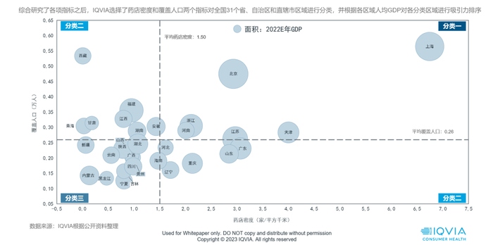 综合研究了各项指标之后,IQVIA选择了药店密度和覆盖人口两个指标对全国31个省、自治区和直辖市区域进行分类,并根据各区域人均GDP对各分类区域进行吸引力排序。