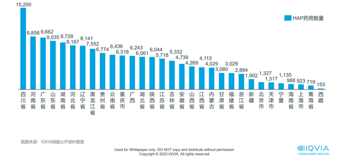 HAP省份数量分布与全国零售药店数量分布基本一致,说明影响其分布的主要原因仍是经济发展水平与人口规模。药店数量排名前三的省份为四川、河南、广东。