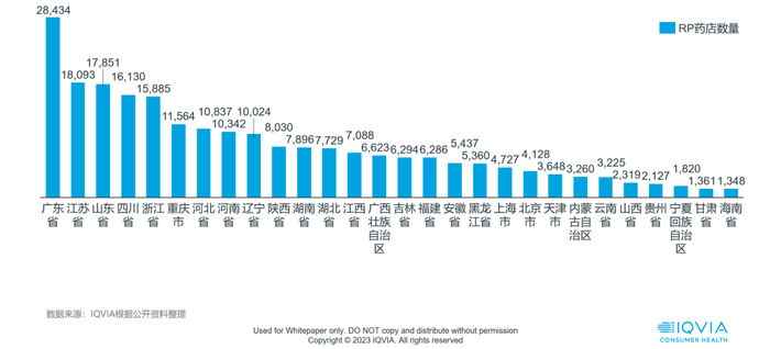 RP药店数量排名前三的省份为广东、江苏、山东,而广东省药店数量为排名第二的江苏省的1.5倍,出现较为明显的头部集中现象。
