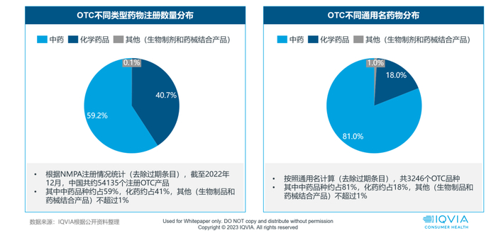 根据NMPA注册情况统计(去除过期条目),截至2022年12月,中国共约54135个注册OTC产品。其中中药品种约占59%,化药约占41%,其他(生物制品和药械结合产品)不超过1%。