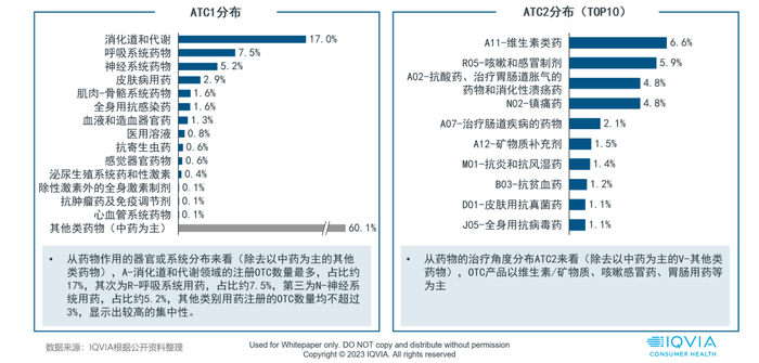 图9:从化药ATC1分类来看,消化道和代谢类OTC产品数量远高于其他分类,其次为呼吸系统和神经系统用药;细分ATC2时,维生素、感冒类、胃肠用药、镇痛等占比较高
