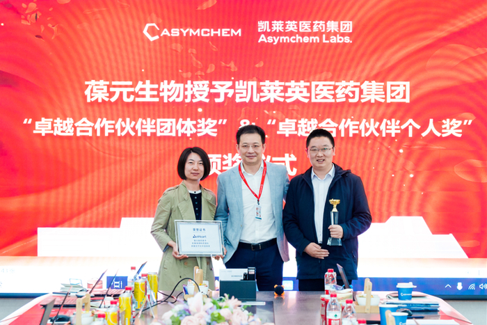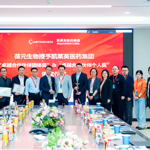 为感谢凯莱英项目团队的出色执行能力、专业的技术和服务效能,葆元医药为凯莱英API团队及制剂团队颁发了“卓越合作伙伴团队”奖,并为API团队的莫大刚、任增荣等;制剂团队的刘智鹏、曹欢等,参与项目执行的个人颁发“卓越合作伙伴个人”奖。未来,凯莱英将继续赋能和支持葆元医药团队,加速推进AB-106研发生产进程,助力该药早日上市,造福全球患者。