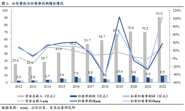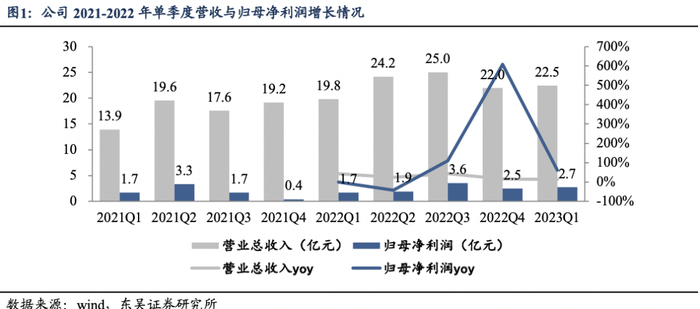 - 事件:2022年,公司实现营业收入90.98亿元(+29.55%,表示同比增速,下同),归母净利润9.48亿元(+37.40%),扣非净归母利润10.59亿元(+103.90%)。2023年Q1季度,公司实现收入22.48亿元(+13.42%),归母净利润2.70亿元(+63.84%),扣非归母净利润2.66亿元(+31.68%)。2023Q1扣非净利润增长符合预期,归母净利润增长超预期。
