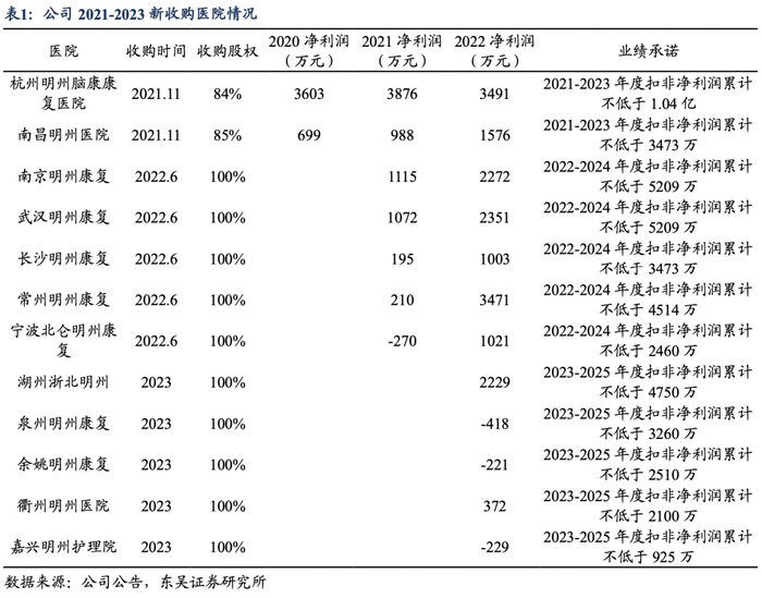 2021年、2022年公司分别从体外产业基金收购2家、5家康复医院,在2023年公告拟收购5家医院,每家医院均有至少3年的利润业绩承诺。从2021年、2022年医院净利润数据完成情况来看,业绩兑现情况较好。随着并购医院持续贡献利润,自建医院逐步成熟实现盈利,我们预计公司医疗服务板块分部利润将有望在2023年、2024年加快增长。
