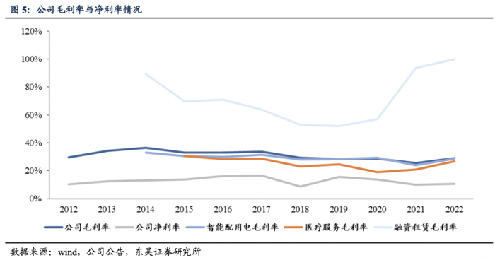 2022年,公司整体毛利率28.88%(+3.51pp)显著提升,主要源自于:1)智能配用电业务板块,成本下降与终端产品价格提升;2)医疗服务业务板块,随着医院产能爬坡、收入增长,毛利率随之提升;3)融资融资租赁业务板块,业务规模将继续收缩,成本下降,毛利率继续提升。分业务来看,2022年,公司智能配用电毛利率28.62%(+4.56pp),医疗服务毛利率26.72%(+5.98pp),融资租赁毛利率100%(+6.26pp)。2022年公司整体净利率10.61%(+0.53pp)。