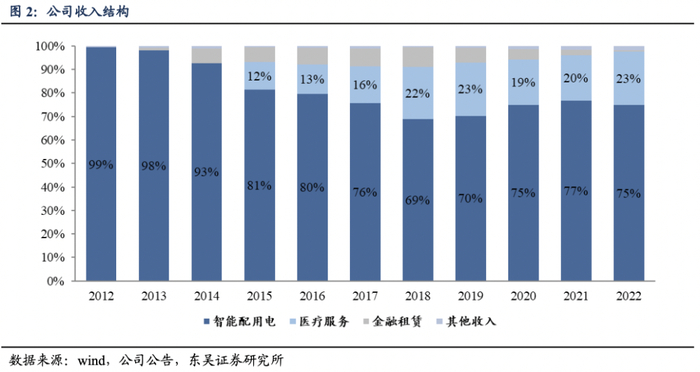 医疗服务营收快速增长,智能配用电业务利润率显著提升。2022年,公司实现营业收入90.98亿元,拆分业务收入来看,智能配用电业务收入68.08亿元(+26.50%),毛利率28.62%(+4.56pp);医疗服务收入20.65亿元(+50.74%),毛利率26.72%(+5.98pp);融资租赁及咨询服务6528万元(-58.67%),毛利率100%(+6.26pp)。拆分业务利润来看,2022年智能配用电实现净利润7.77亿元(+59%),超出股权激励目标值;2022年医疗服务分部净利润1.56亿元(+62%),估计加回股权激励费用摊销费用的备考利润超2亿元。2022年,公司非经常性损益-1.1亿元,其中:铜期货、锁汇确认投资损失 1.42亿元及公允价值变动收益 107万元、非流动金融资产公允价值变动损失8896万元等。公司通过“自建+并购”推进康复医疗板块扩张,医疗服务板块实现收入端高速增长。公司智能配用电订单快速增长,在疫后订单收入确认恢复正常节奏、成本压力下降、产品升级带来价格提升的情况下,智能配用电业务毛利率、净利率显著提升。