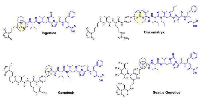 Auristatins是ADC中使用的重要有效载荷,最著名的家族成员MMAE存在于两种上市药物Adcetris和Polivy中。目前,超过10种以金盏花素(如MMAE)或一甲基金盏花素F(MMAF)为有效载荷的ADC正在进行临床试验。