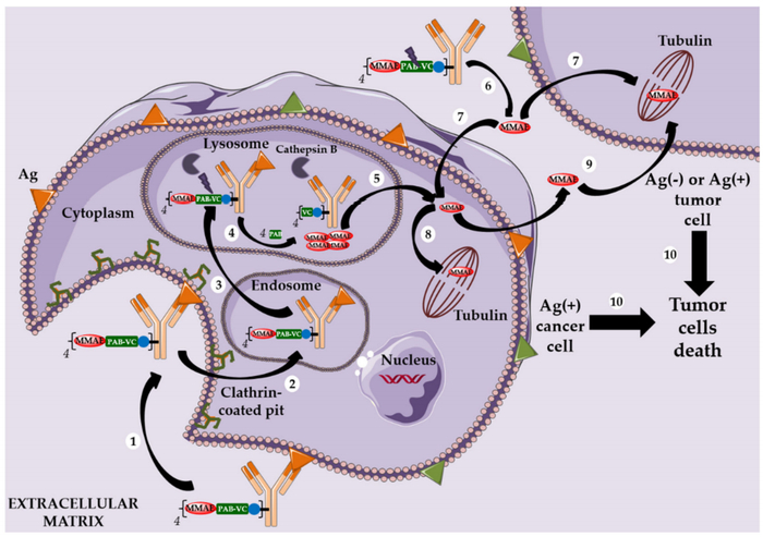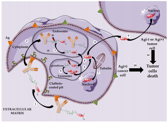 ADC对抗原的识别导致ADC通过内吞途径进入细胞内,通过溶酶体降解后,有效载荷以生物活性形式释放并发挥作用,导致癌细胞死亡。细胞内有效载荷的数量由每个细胞表面抗原的数量、每个ADC的药物有效载荷分子的数量(也称为药物抗体比率,DAR)以及抗原返回细胞表面所需的时间决定。有效载荷可能在癌细胞死亡和降解后逃逸,也可能从胞浆中透膜而出。这种释放的后果可能是有益的(也称为旁观者效应),也可能是有害的,导致全身毒性。