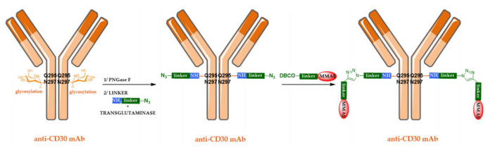 谷氨酰胺残基自然存在于单抗的每个重链的Fc区域。在295位去糖基化后,谷氨酰胺残基通过MTGase介导的反应偶联,可以产生均一的DAR=2的ADC。为了提高效率,可以偶联带支链的连接子,从而使DAR翻倍,297位的天冬酰胺突变为谷氨酰胺也可增加DAR。