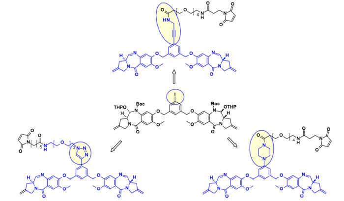 以类似的方法,Spirogen和Genentech设计了一种碘苯连接的PBD,允许在过渡金属催化反应中引入不同的连接子。通过使用Sonogashira偶联、Buchwald–Hartwig偶联或叠氮化物-炔烃点击反应,分别获得炔烃、哌嗪或三唑连接的连接子有效载荷共轭物。