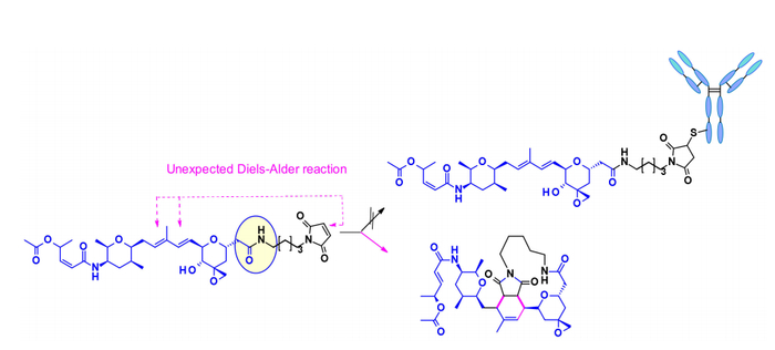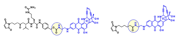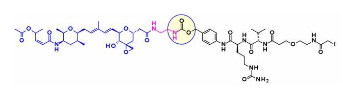 将这种天然产物用于ADC的另一个困难是存在多种反应性功能。例如,中心核中的二烯可以通过Diels–Alder反应与用于生物结合的马来酰亚胺部分反应。这个问题是通过使用另一个共轭部分,卤代乙酰胺来解决的。结合这两种修饰并包含可切割连接子的ADC首次在专利文献中报道,并且声称它们在几个表达HER2的细胞系中具有适度的活性。