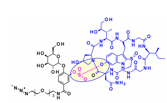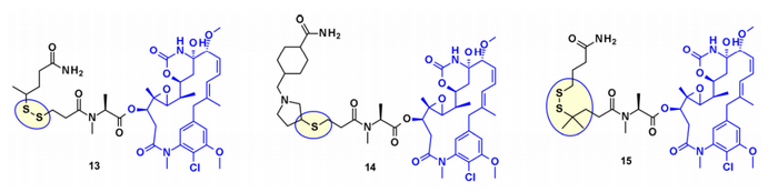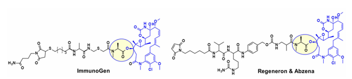 此外,几种基于maytansine的ADC利用相同的二级羟基作为附着点,并在大多数情况下携带转谷氨酰胺酶生物结合的连接子。例如,一种基于Daratumumab的ADC被证明能向CD38过度表达的癌细胞特异性地传递DM4。最近ImmunoGen开发了一种新型的ADC,它包含一种含硫的maytansinoid,通过一种高度稳定的三肽连接体连接到抗体上,附着点与上述羟基相同。与先前的美登素ADC相比,增加连接物中亚甲基单元的数量增加了旁观者杀伤活性,并提高了小鼠体内的疗效。在类似的方法中,保持核心大环不变,Regeneron和Abzena的研究人员研究了N-甲基丙氨酸氮取代的影响,也改变了大环上侧链的长度,以及通过伯胺和仲胺连接的连接子。
