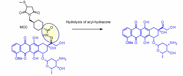 该方法已成功应用于IMMU-110,包含一个可裂解酰基腙连接子,由4-马来酰亚胺甲基环己烷-1-羧酸盐(MCC)的酰肼与阿霉素中存在的酮基反应中形成。