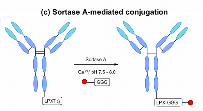 NBE Therapeutics开发了基于S金黄色葡萄球菌转肽酶A介导的偶联。他们的策略利用转肽酶A(SrtA),在LPXTG(X=任何氨基酸)五肽的基序中切割苏氨酸和甘氨酸残基之间的酰胺键。然后,它催化甘氨酸相关的有效载荷与新生成的C-末端的偶联,在生理温度和pH下生成肽键。