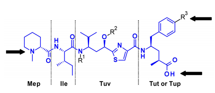 Tubulysins是微管聚合的有效抑制剂,可导致分裂细胞的细胞骨架迅速解体,并导致细胞凋亡。它们是一个天然存在的四肽家族,含有Mep、Ile、Tuv和Tut,R3=OH或Tup,R3=H。