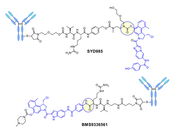 在Synthon开发的SYD985中,苯酚基团是通过双氨基甲酸酯连接连接子与Mc-val-cit-PABC有效载荷的位置。组织蛋白酶B裂解后,游离苯酚促进分子内重排成亲电环丙基形式。Medarex采用了一种不同的方法,通过分子非烷基化部分的芳香胺连接连接子,并用N-甲基哌嗪氨基甲酸酯部分掩蔽苯酚前药。在体内,苯酚将被释放,随后活性环丙烷将在羧酸酯酶的作用下形成。