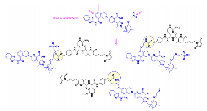 抗凋亡Bcl-2家族成员(包括Bcl-xL)的过度表达是癌细胞获得凋亡抵抗的机制之一。能够阻断Bcl-xL上BH3结合域的药物可以触发癌细胞凋亡。2017年,AbbVie首次以ADC的形式展示了BcL-xL抑制剂的有效载荷,其靶向表达EGFR的特定细胞或组织。有趣的是,研究人员在有效载荷上使用了三个不同的连接点来连接可切割的连接子。氨基烷基延伸的核心修饰用于在需要时建立合适的连接位点。