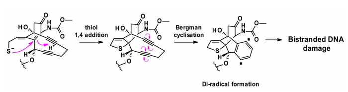 有效载荷的释放分两步进行:在酸性细胞内环境中对腙进行敏感的裂解,然后通过细胞内谷胱甘肽还原二硫键。释放的硫醇发生分子内1,4-加成的烯酮触发伯格曼环化反应,产生一个二自由基。这种活性中间体能够从脱氧核糖骨架中提取氢原子,产生双链DNA断裂,进而导致细胞死亡。