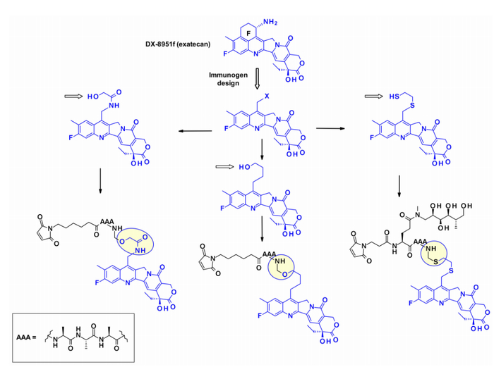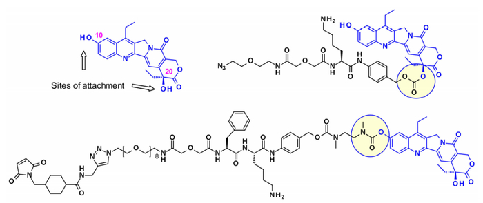 Immunomedics建立了两种不同的策略,通过其羟基部分结合SN-38。在一个例子中,连接子通过反应性更强的C-10苯酚基团连接,从而产生稳定的氨基甲酸酯键,而在另一个例子中,通过C-20羟基,同时稳定内酯形式,而C-20羟基对体内效力至关重要。