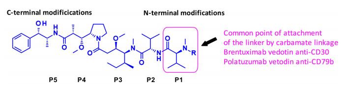 上图描述了auristatine及其常用的连接位点。金盏花素的构效关系(SAR)已被广泛研究,主要集中在末端亚单位:P1(N-末端)和P5(C-末端),最常见的方法是在P1上引入氨基甲酸酯功能。