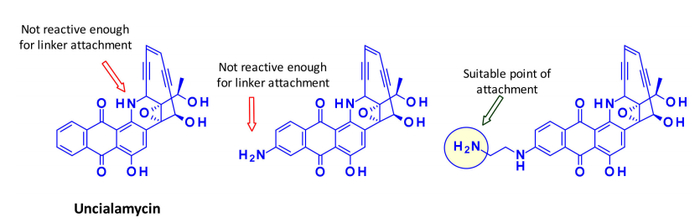 BMS的研究人员表明,由于在各种肽偶联条件下反应活性较低,因此,Uncialamycin的仲胺不是一个合适的连接点。研究人员合成了一种类似物,其中一个氨基直接引入到芳香环上,但这种苯胺的反应性也太弱,不能作为连接子引入的基团。另一方面,使用氨基乙基延伸物安装脂肪族胺,为连接子提供了合适的连接点。