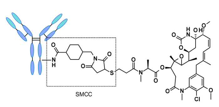 鉴于这些发现,人们继续开发连接子设计的替代策略。然而,一个偶然的发现使Immunogen得以识别出一种出人意料的有效ADC。DM1通过含有N-琥珀酰亚胺基-4-(N-马来酰亚胺甲基)环己烷-1-羧酸盐(SMCC)的不可切割的连接子与曲妥珠单抗的赖氨酸残基偶联,这种ADC(T-DM1,Kadcyla)于2013年经FDA批准用于HER2阳性乳腺癌患者。