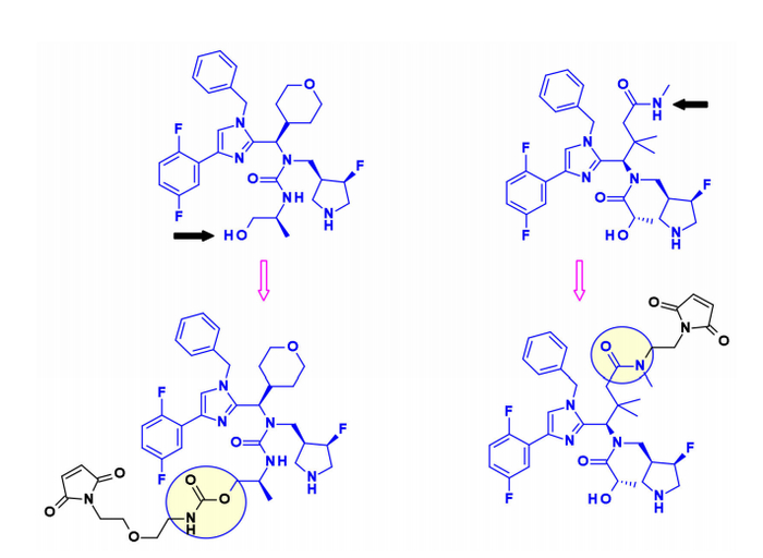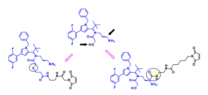 同样,诺华的研究人员使用含咪唑的KSP抑制剂作为Eg5 ADC。利用伯醇或仲酰胺部分,他们安装了带有马来酰亚胺端基的不可裂解连接子。当与靶向HER2和c-KIT的抗体偶联时,得到的ADC显示出优于Kadcyla的体内疗效。