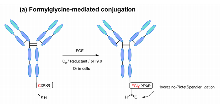 Aaron等人探索了一种新的利用醛标记蛋白质的位点特异性偶联。该技术利用了基因编码的五肽序列(Cys-X-Pro-X-Arg),其中半胱氨酸残基被FGE识别,并在细胞中蛋白质表达期间被共翻译氧化为甲酰甘氨酸。这样,工程化抗体通过HIPS(hydrazino-Pictet–Spengler)化学方法与醛特异性连接子选择性偶联。