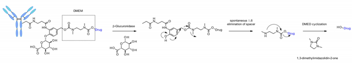 该连接子还通过一个额外的二甲基乙二胺(DMED)自降解间隔子应用于其他含胺的有效载荷,如喜树碱类似物、SN38、杜卡霉素和苦参碱。释放顺序从水解β-葡萄糖醛酸到自降解间隔子,DMED的另一个环化反应自发发生,形成1,3-二甲基咪唑啉-2-酮,并最终释放含羟基药物。由于连接子的亲水性,与组织蛋白酶敏感连接子相比,该技术使ADC的DAR=8制备更为容易。