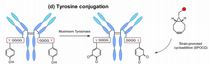 另一个新兴的新方法是通过酪氨酸标签进行位点特异性抗体标记,酪氨酸标签与单克隆抗体轻链的C末端基因融合。考虑到位点可及性,Bruins及其同事使用了一种工程化的四甘氨酰酪氨酸残基作为标记,它为偶联提供了一个容易触及的位点。酪氨酸酶将酪氨酸氧化成1,2-醌,从而允许与各种双环[6.1.0]壬炔(BCN)衍生物的环加成反应。这种方法可以与含有BCN连接子的MMAE有效地偶联。