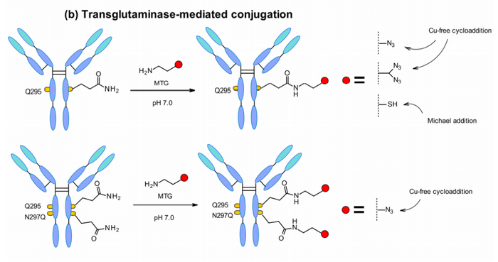 微生物转谷氨酰胺酶(MTGase)策略也经常被开发用于定位特异性偶联。MTGase催化在脱糖抗体295位置的谷氨酰胺侧链与底物的伯胺之间形成肽键。与其他酶策略相比,MTG是一种灵活的技术,不需要肽供体来实现偶联。只要酰基受体含有一种伯胺,就没有结构限制。