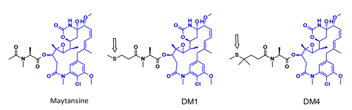 美坦辛是一种非常有效的微管组装抑制剂,可诱导细胞的有丝分裂停止。但是这种结构很难共轭,因为它没有反应性官能团,为了克服这个问题,一系列含有SMe基团的非常有效的衍生物被创造出来。这一类分子的第一个例子是DM1和DM4,它们带有甲硫丙酰基而不是天然N-乙酰基。