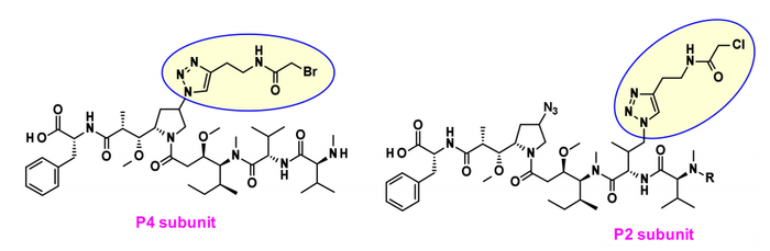最近,Agensys公司通过调节中心亚基P2-P3-P4,将叠氮化物基团引入P2和P4亚基,在与蛋白酶可裂解的连接子偶联后,产生了在体外和体内效力提高的亲水性衍生物,这为连接子的连接提供了新途径。