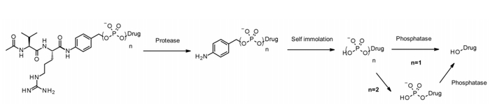 与组织蛋白酶一样,焦磷酸酶和磷酸酶也是在溶酶体中选择性表达的水解酶。2016年,默克公司的研究人员设计了含有磷酸和焦磷酸的连接子与组织蛋白酶B敏感的Val-Cit-PABA搭配,旨在传递糖皮质激素:磷酸盐/焦磷酸盐部分结合在自降解间隔子PABA和有效载荷之间。内化后,有效载荷可通过组织蛋白酶B、自降解间隔子和磷酸酶(n=1)的顺序释放。对于焦磷酸酯(n=2),可能需要另一个涉及焦磷酸酶的步骤。