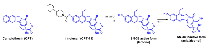 喜树碱(CPT)及其衍生物是拓扑异构酶I抑制剂的经典例子。它们稳定了拓扑异构酶诱导的DNA单链断裂,当三元DNA-TOP1-抑制剂复合物遇到复制叉时,DNA发生双链断裂。天然喜树碱是一种五环结构,其极低的溶解性阻止了其作为癌症治疗药物的广泛应用。其水溶性前药伊立替康获得了转移性结直肠癌的上市许可。SN-38是伊立新坦的活性代谢物,通过人体肝脏羧酸酯酶的作用在体内生成,其可通过打开内酯环而失活。