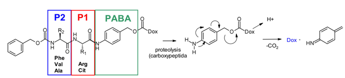 组织蛋白酶B是一种半胱氨酸蛋白酶,存在于哺乳动物的晚期内体和溶酶体中,在许多癌细胞中也过度表达。最初,一种可切割的二肽作为组织蛋白酶B的底物用作阿霉素前药,这项工作建立了SAR的二肽部分:P1位置需要亲水性残基(瓜氨酸或精氨酸),而P2位置的亲脂性残基增强血浆稳定性(苯丙氨酸、缬氨酸或丙氨酸)。