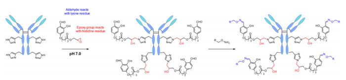 2018年,Rai等人报告了另一种利用“化学关键蛋白”的可逆分子间反应进行的位点特异性修饰。该试剂携带多种官能团,这些官能团在所有可获得的赖氨酸残基上可逆地形成亚胺部分。然后,关键蛋白通过试剂中的环氧化物与近端组氨酸残基反应。因此,在生理条件下,关键蛋白从赖氨酸中分离,醛被再生,从而能够通过肟结合标记抗体。