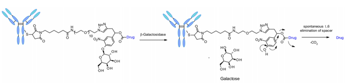 最近报道了一种使用β-半乳糖苷酶裂解连接子的ADC,其中包含PEG10间隔子。间隔子被硝基取代,以提高自降解速率。类比β-葡萄糖醛酸酶连接子,其解离机制涉及水解β-半乳糖苷酶部分,它赋予化学前体亲水性。另一个优势是β-半乳糖苷酶仅存在于溶酶体中,而β-葡萄糖醛酸酶在溶酶体中表达,也在实体瘤的微环境中表达。研究证明,在抗HER2-ADCs释放MMAE的背景下,含β-半乳糖苷酶连接子的 ADC在体外和体内均比T-DM1更为有效。