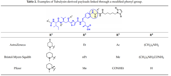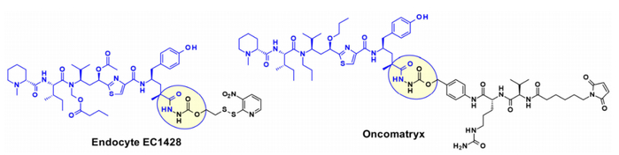 利用Tubulysins作为ADC有效载荷,其广泛的附着点已被充分开发。这种结构中一个明显的附着点是Tut或Tup模块的羧酸,如Endocyte的EC1428,其中羧酸通过酰肼部分连接到连接子。Oncomatryx公司也采用了同样的方法,以同样的方式安装了可切割的PABAValCit马来酰亚胺连接子。