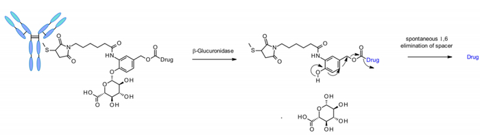 β-葡萄糖醛酸酶是一类糖苷酶,催化β-葡萄糖醛酸残基的水解,它在溶酶体和肿瘤间质中高表达。西雅图遗传学的研究人员于2006年发表了一项开创性的工作,抗CD70 ADC使用了含葡萄糖醛酸的连接子,葡萄糖醛酸附着在自降解间隔子上。这种连接子表现出低水平的聚集、高血浆稳定性、以及强大的体内功效。