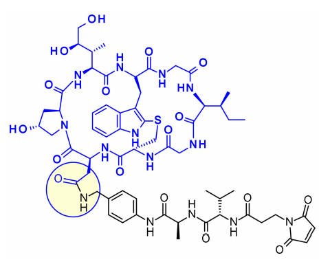 与此同时,西雅图遗传学设计了自己的偶联技术,通过可切割连接子mc-VC-PABC,其中包含马来酰亚胺基间隔子、作为组织蛋白酶底物的标准Val Cit二肽序列和PABC自降解间隔子,将金盏花素(MMAE)生物偶联到抗CD30 抗体的半胱氨酸残基上,这种ADC(Adcetris)于 2011年被FDA批准用于间变性大细胞淋巴瘤和霍奇金淋巴瘤的治疗。