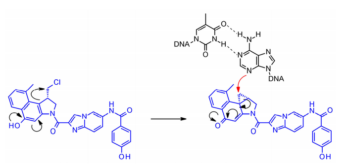 杜卡霉素是一种强大的细胞毒性物质,通过其高活性的环丙烷环与DNA的小凹槽结合,并在N3位置烷基化腺嘌呤。非环化的,卤甲基形式的杜卡霉素细胞毒性活性显著降低。由于分子中苯酚基团可作为内消旋体激活剂,从而形成亲电环丙烷,因此杜卡霉素ADC开发中的连接策略集中于酚官能团的连接子连接。