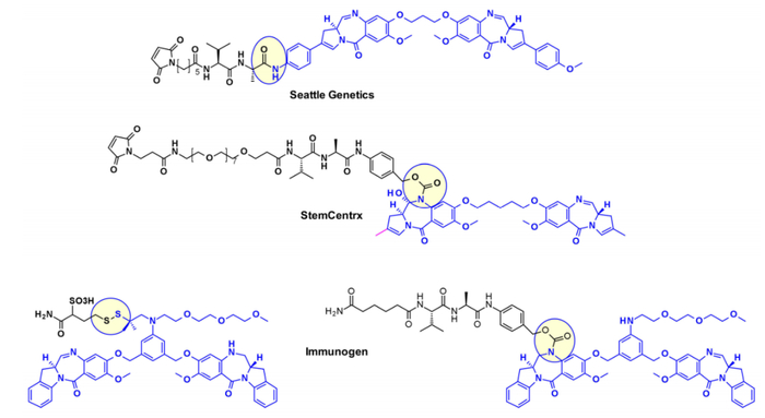 西雅图遗传学使用SGD1882的苯胺作为附着点,模仿可切割连接子中常用的PAB单元,释放自由的PBD有效载荷。StemCentrx与Spirogen合作,利用PBD的N-10位置连接一个氨基甲酸酯的连接子。同样的氨基甲酸酯键也被Immunogen用于结构相似的吲哚氯苯偶氮卓二聚体(IBD)有效载荷。他们还报道了同一类IBD的不同方法,其中一个取代的苯环被用作两个IBD单体的C8/C8'位置之间的连接物。
