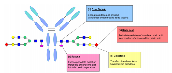 除这些偶联策略外,半乳糖残基也可以作为修饰位点。多项研究报告了通过使用突变的β- 1,4-半乳糖转移酶,将半乳糖替换为一种含酮或叠氮官能团的半乳糖,这种具有双正交官能团的半乳糖衍生物为高效偶联开辟了途径。这些技术已被开发用于成像和抗癌应用。