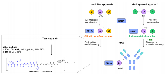 这种技术基于络合和偶联两个步骤。氮杂环配体如哌啶与Lx配位形成络合物前体,稳定的中间体包含有效载荷和配体上的一个氯离子。该复合物含有带正电荷的Pt(II)中心,这提高了连接子和有效载荷复合物的水溶性并最小化抗体聚集,该方法还扩展到类似的碘络合物。在最近的一份报告中,碘化钠的使用被证明可以显著提高该技术的偶联产率和选择性。Cl-Lx-药物载荷络合物上残留的氯配基与碘化物的交换生成更具活性的I-Lx-药物载荷,从而获得更高的偶联产率。这项技术已被应用于ADC药物的大规模生产。