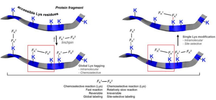 这种关键蛋白的定向修饰技术后来发展成单赖氨酸残基标记技术,即使在存在N-末端胺的情况下也具有毋庸置疑的选择性。方法的成功依赖于Fk1-间隔子-Fk2试剂。