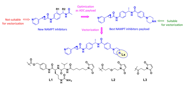 诺华公司的研究人员在NAMPT抑制剂有效载荷中的苯环对位中引入哌嗪部分,确定了合适的连接子附着点。这种分子在c-Kit和HER2表达细胞系上表现出纳摩尔水平的效力,并且耐受性良好,在体内表现出靶向依赖性。