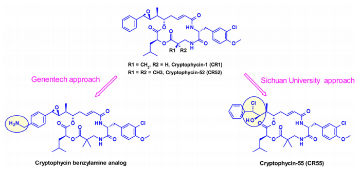 几个小组尝试将CR用于ADC,但是由于在CR中缺少偶联位点,目前,有两种不同的方法通过引入其它基团,使得能够连接ADC的连接子。一种是由基因泰克的研究人员将苯转化为苄胺以产生有效的有效载荷,这种有效载荷适合通过氨基甲酸酯键连接。在第二种方法中,四川大学的研究人员利用了隐霉素-52的前药形式(CR55),它可以在生理条件下重新环化为CR52。